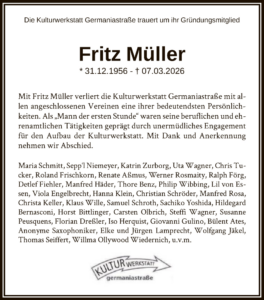 Wir trauern um unseren langjährigen Kollegen, Freund, Gefährten und Kulturwerkstatt-Mitbegründer Fritz Müller
