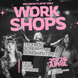 MELODIVA Workshops FLINTA* only![]() 25./26. April, ab 11 Uhr | Songwriting mit Katerina Zhukova Du möchtest einen eigenen Song schreiben und weißt nicht wie? Du hast schon einen Text, aber noch keine Musik? Wie überwindest Du eine Schreib-Blockade? In unserem Songwriting-Workshop mit Katerina Zhukova – Popakademie Master-Absolventin – kannst Du wertvolle Übungen & Tipps von einer Profi-Songwriterin kennenlernen und Dich mit anderen austauschen. Unter dem Künstlernamen LOEN erschafft Katerina eine intime Klangwelt zwischen Indie-Folk und Art-Pop. Sie schreibt Heilungslieder für unruhige Herzen und vereint in ihrer Musik die Melancholie von Feist, die Ausdruckskraft von Stevie Nicks und die tief verwurzelte Sehnsucht traditioneller Volkslieder. In ihren Live-Auftritten verbindet Loen poetische Texte mit einer warmen, authentischen Bühnenpräsenz, die das Publikum in eine sanfte, fast meditative Stimmung versetzt. Für Loen ist Musik ein Weg der Heilung – ihre Songs laden dazu ein, sich zu erinnern, zu fühlen und sich selbst wiederzufinden. Live-Sound-Technik mit Tilli Treier (keine Pronomen) Geleitet wird der Workshop von Tilli Treier aus Frankfurt. Tilli hat 15 Jahre Banderfahrung an unterschiedlichen Instrumenten, schreibt und produziert Musik für eigene wie andere Projekte und coacht bzw. leitet Workshops insbesondere für interessierte FLINTA*-Gruppen. Tilli ist momentan aktiv in den Bands: TOYBOYS, Kill Morrissey, Suspectre, Die platzenden Pickel. Screaming-Workshop mit Laura Gierl (sie/ihr) Aufgrund der hohen Nachfrage haben wir diesen Workshop nun zum zweiten Mal für Dich im Angebot! Dieser Workshop eignet sich für Beginnende, aber auch für Fortgeschrittene, die sich der Technik und Anatomie nicht bewusst sind oder sich selbst noch einmal kontrollieren möchten. Bitte bringt euch etwas zum Trinken mit (Wasser oder Tee, keine Milchprodukte oder Limo) und ein großes Handtuch. Auf jeden theoretischen Teil folgen praktische Übungen. Im Anschluss gibt es eine offene Fragerunde, in der Laura noch einmal auf deine konkreten Fragen oder Probleme eingehen kann. Am Ende des Workshops werdet ihr Werkzeuge an der Hand haben, um eigenständig zu üben und euch zu kontrollieren. Laura ist seit ihrem 19. Lebensjahr als Sängerin im Metalgenre tätig. Mit ihrer Band „The Tex Avery Syndrome“ ist sie seit über 10 Jahren auf den Bühnen in ganz Deutschland und darüber hinaus zu Hause. Als Tontechnikerin hat sie die deutschen Stimmen für Final Fantasy, World of Warcraft, Resident Evil und mehr aufgenommen und mit namhaften Synchronsprecher*innen gearbeitet. Zudem hat sie auch ihre Stimme für Creatures der BOOM Library zur Verfügung gestellt. Seit knapp 3 Jahren gibt sie Unterricht und Workshops für Harsh Vocals. Preise: Ein-Tages-Workshop Screaming mit Laura Gierl: 25 € Zeiten: 11:00–17:00 Songwriting-Workshop oder Sound-Technik: Solidarische Staffelpreise: 25 € ermäßigt, 50 €, 75 € Support Zeiten, Technik-Workshop: Sa. 11:00–16:00, So. 11:00–17:00 Zeiten, Songwriting-Workshop Sa. 11:00–17:00, So. 11:00–17:00 Anmeldung: Songwriting Technik Screaming |